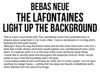 This document discusses different font options for a band's print production. It evaluates several sans serif fonts on criteria like readability at small sizes, consistency between uppercase and lowercase letters, uniqueness, and whether they match the aesthetic envisioned for the band. In the end, the author likes one font for its retro look but worries another option appears too sci-fi due to its italicization. Overall, the document analyzes fonts' suitability for the band's materials based on visual style, readability, and consistency across elements.