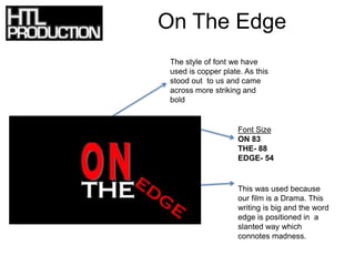 The document discusses the font choices for different sections of a film production. Copperplate font was used for the title "On The Edge" because it is striking and bold, fitting for a drama film. The words are in different sizes to connote madness. Arial font in size 16 was used for the text "I AM NOT A LOSER" to make it stand out and convey the main character's struggles. Arial font in size 12 with a Facebook background was used for the credits and scenes of cyber bullying on social media.
