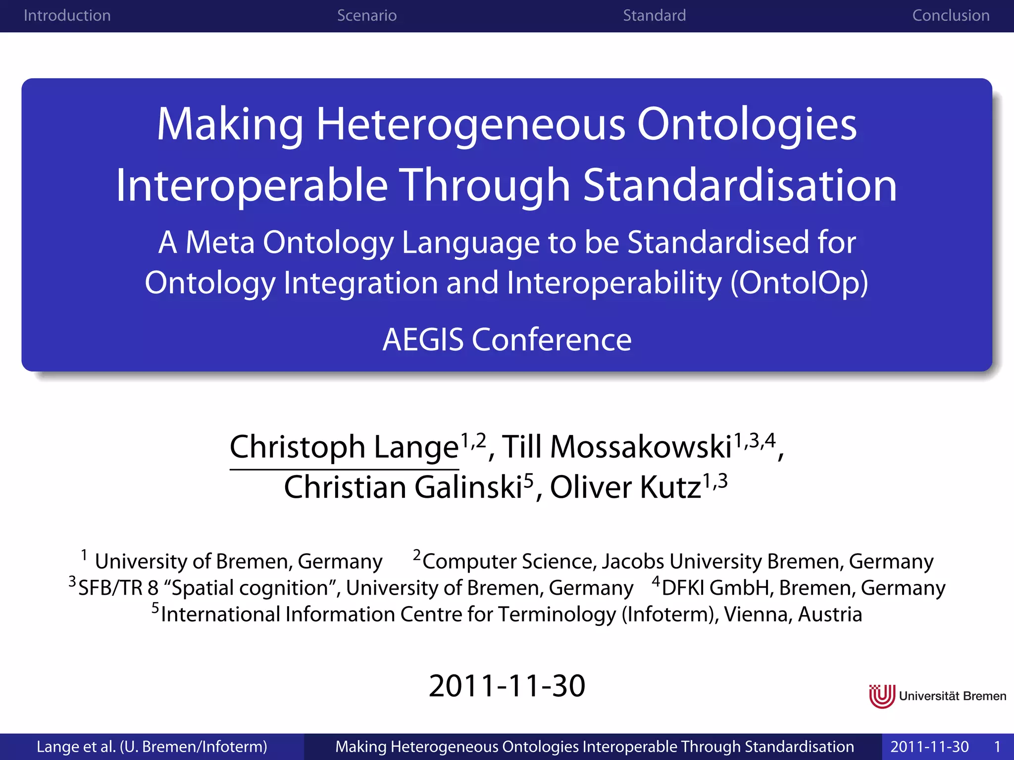 The document discusses making heterogeneous ontologies interoperable through standardization, presenting a scenario of an assisted living environment where different devices like a wheelchair and freezer need to communicate but use different ontologies. It argues for developing a standardized meta ontology language to facilitate integration and interoperability between these diverse ontologies used by different devices with varying knowledge needs.