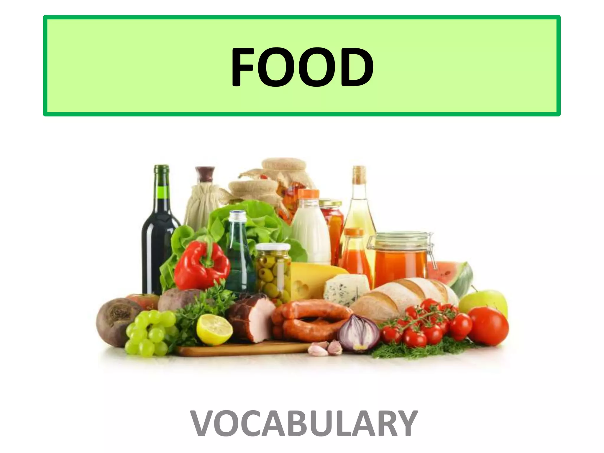 This document contains a list of foods organized into categories including grains, vegetables, fruits, dairy products, meats, fish and seafood, eggs, nuts and beans, sweets, oils and fats, sauces, and drinks. It provides examples of common items found in each category such as pasta, tomatoes, and carrots in the grains and vegetables sections as well as cheese, chicken, salmon, eggs, chocolate, tea, and wine.