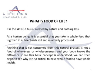 This document discusses the importance of whole, natural foods for optimal health and longevity. It defines food of life as whole foods created by nature and minimally processed. It warns of the negative health impacts of the denaturation and artificial modification of foods through industrial processing and the addition of chemicals. The document provides extensive lists and descriptions of whole foods to consume and processed foods and other items to avoid or minimize. It emphasizes choosing organic, non-GMO foods grown without pesticides whenever possible.