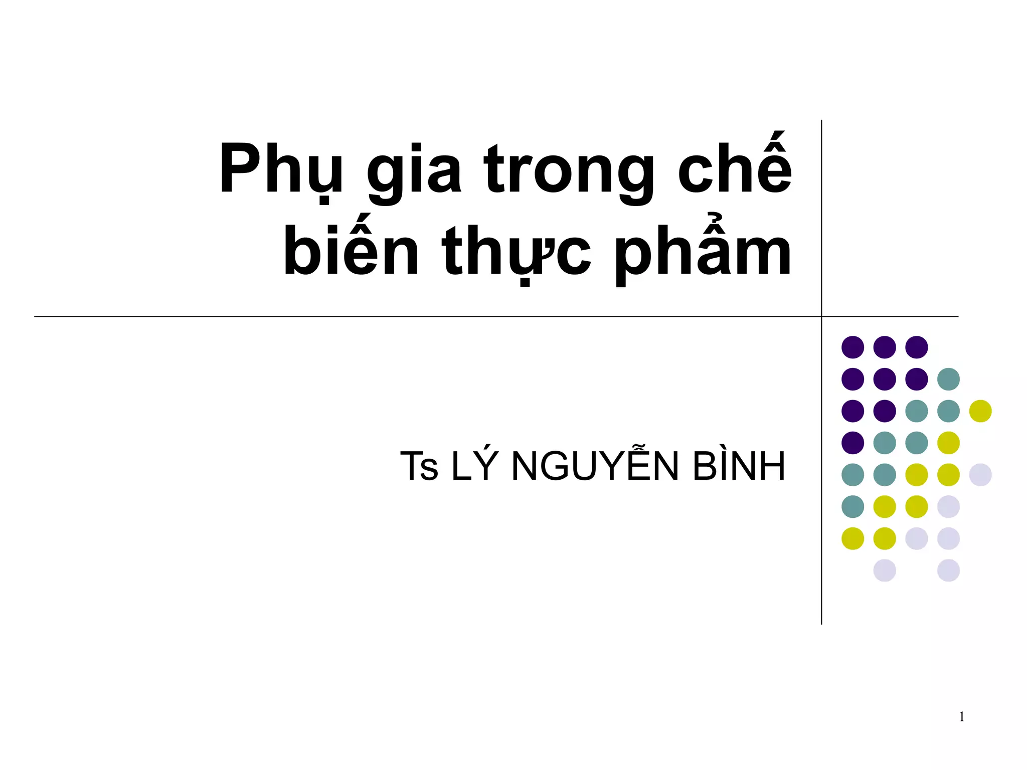 Tài liệu trình bày về phụ gia thực phẩm, bao gồm các loại phụ gia và định nghĩa, cũng như tầm quan trọng và nguy hại khi sử dụng chúng. Nó thể hiện các quy định về sử dụng phụ gia thực phẩm tại Việt Nam và thông tin về sản xuất và tiêu thụ phụ gia trên toàn cầu. Nhiều loại phụ gia như chất bảo quản, chất chống oxy hóa, và enzyme được đề cập, cùng với các nguy cơ sức khỏe liên quan đến việc sử dụng không đúng cách.