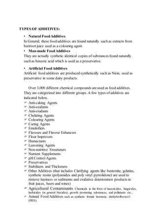 Food additives are substances added to food to improve properties like flavor, texture, appearance and shelf life. They have been used for centuries with spices and preservatives, but modern processing has increased both the variety and amount of additives used. Over 3,000 chemical compounds are used as additives and categorized based on their function, including preservatives, flavors, colors, stabilizers and thickeners. While additives allow for many modern convenience foods, their use must be regulated and labeled to ensure consumer safety.