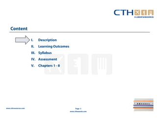 This document outlines a training module on food and beverage operations. It includes a description of the module's aims to provide an understanding of operational and supervisory aspects of running food and beverage establishments. The learning outcomes cover key areas of food and beverage operations. The syllabus details the topics that will be covered in each of the 8 chapters, including food production, purchasing, menu planning, and banqueting. Learners will be assessed through a 2.5 hour exam covering short and long answer questions.