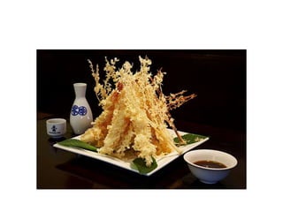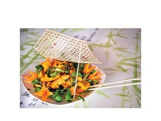 Food art is the art of modifying and decorating food to enhance its aesthetic appeal. It involves creating beautiful models out of food. The visual presentation of food is considered at many stages, from how meats are tied to plating styles. Food may be decorated with icing, toppings, or garnishes. One renowned form is Japanese food art which uses decorative garnishes like carved vegetables. Plating arranges the main item and sides artistically on a plate. Food art is also used in advertising to make products look delicious. Cake art is a common form and involves decorating cakes with icing, sugar, chocolate or molded flowers.