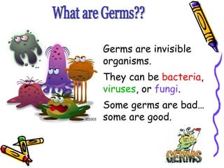 This document discusses proper hand washing techniques to avoid spreading germs. It explains that germs are microorganisms that can be bacteria, viruses, or fungi, and some are harmful while others are helpful. It recommends washing hands with warm water and antibacterial soap after various activities like coughing, sneezing, using the bathroom, playing outside, and handling pets to remove bad germs. It also suggests singing songs for 20-30 seconds during washing and using hand sanitizer when soap and water aren't available.