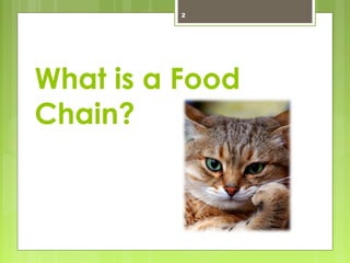 A food chain is a linear sequence of organisms in a food web where each organism transfers energy by being eaten. Producers, like plants, are the first links as they get energy from the sun. Herbivores eat producers. Carnivores eat herbivores or other carnivores. Omnivores eat both plants and animals. Detrivores and decomposers break down dead organisms, recycling nutrients. If one link is removed, it affects the entire food chain.