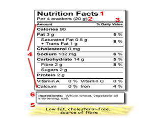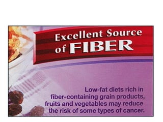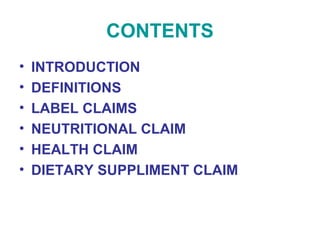 This document provides a summary of a seminar presentation on food claims. It defines key terms like food, nutrient, health, and claim. It discusses various types of claims including nutritional claims, health claims, and dietary supplement claims. It provides details on how to read a food label and understand terms like daily values, nutrients, and definitions of common claims like low fat, lean, and high. The document aims to educate about the important information provided by food labels.