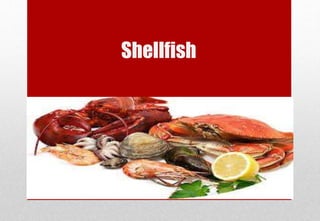Dokumen ini membahas berbagai jenis shellfish, termasuk crustaceans, echinoderms, dan mollusks, serta cara membeli dan menyimpan mereka. Informasi mencakup tips untuk memilih shellfish yang segar dan kondisi penyimpanan yang tepat untuk menjaga kualitasnya. Selain itu, terdapat penjelasan mengenai spesies spesifik seperti lobster, kepiting, dan tiram dalam konteks makanan laut.