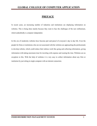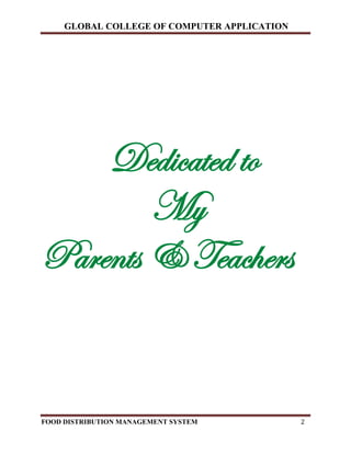 The document outlines the development of a Food Distribution Management System aimed at automating the management of ration card holders and food grain distribution. It highlights the challenges of manual record-keeping and presents a proposed software solution that centralizes data, enhances security, and improves operational efficiency. The system leverages modern technologies like VB.NET for frontend and Oracle for backend, catering to a wide range of functionalities including inventory control and delivery management.