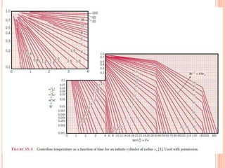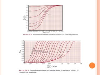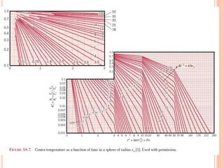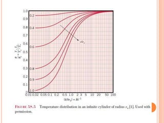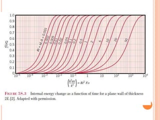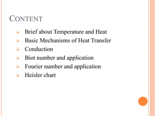 This document summarizes a presentation on heat transfer mechanisms including conduction, convection, and radiation. It discusses key concepts like temperature, heat, the three mechanisms of heat transfer, conduction, Biot number, Fourier number, and Heisler charts. Conduction involves transfer of kinetic energy between adjacent molecules. Biot and Fourier numbers are dimensionless parameters used in heat transfer calculations to characterize conduction regimes and transient behavior. Heisler charts provide a graphical tool to analyze heat transfer problems.