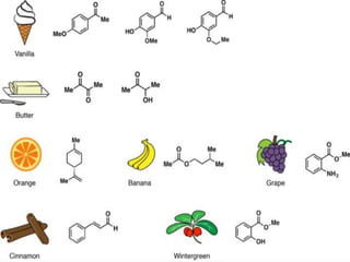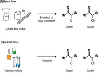 The document discusses various types of food flavors and their biosynthesis, categorizing them into natural, nature-identical, and artificial flavoring substances. It details the chemical components that contribute to flavors, such as volatile compounds and specific examples like vanilla and butter. The conclusion highlights the intersection of art and science in flavor chemistry and the potential for novel flavor combinations.