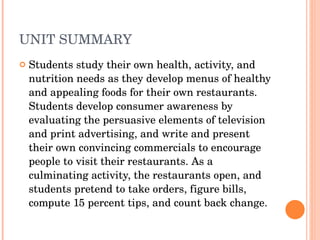 The document outlines a unit plan for a middle school health and nutrition lesson. Students will study their own health, nutrition needs, and create menus for imaginary restaurants. They will analyze food advertising, write commercials, and role play running a restaurant. The unit incorporates standards in health, math, science, and technology and aims to develop student awareness of healthy eating through experiential learning activities.