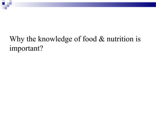 The document discusses the importance of understanding food and nutrition. It defines key terms like food, nutrition, diet, and provides objectives for a lecture on the topic. The main points are that nutrition is related to health and disease, and food provides energy, essential nutrients, and reduces disease risk if consumed as part of a healthy diet. The document also outlines the basic food groups including grains, vegetables, fruits, dairy, proteins, and fats/oils, and provides details on examples of foods in each group and their nutritional benefits.
