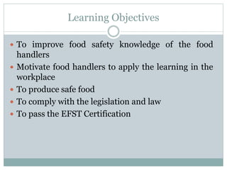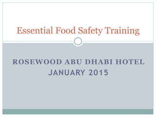 This document outlines an essential food safety training for food handlers at the Rosewood Abu Dhabi Hotel in January 2015. The learning objectives are to improve food safety knowledge, motivate safe practices, and ensure compliance. Key topics covered include foodborne illness prevention, personal hygiene, pest control, cross-contamination, cooking and chilling food safely, cleaning procedures, and the importance of separating raw and ready-to-eat foods. Food safety best practices such as proper handwashing, protective clothing, cooking to safe temperatures, and chillling food quickly are emphasized.