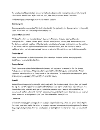 The document summarizes several popular non-vegetarian dishes from Goa, India. It describes Goan curry rice as the staple diet for Goans featuring fish curry and rice. It also discusses spicy dishes like vindaloo curry, xacuti made with poppy seeds and coconut, and cafreal chicken marinated in a Portuguese peri-peri sauce. Additional dishes mentioned include sorpatel made with pork organs, chourisaan pork sausages, fish rechad stuffed with spice paste, and balchao fish or prawn pickle brought by the Portuguese from Macao.