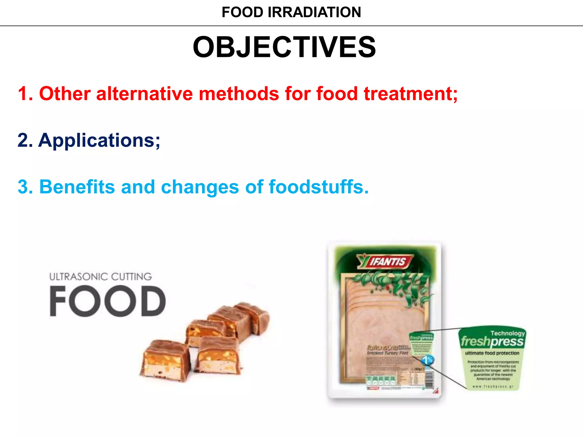This document discusses alternative methods for food treatment, including ultrasound treatment (sonication), high pressure processing, pulsed electric fields, pulsed light technology, cold plasma treatment, and dense phase CO2 treatment. It provides details on the mechanisms, equipment, and applications of ultrasound treatment for food processing. High pressure processing is described as using pressures from 100-1000 MPa to reduce spoilage microorganisms. Pulsed electric fields apply short high voltage pulses between electrodes at 5-80 kV/cm to treat foods. Videos and additional resources are provided for pulsed light technology, cold plasma treatment, and dense phase CO2 treatment.