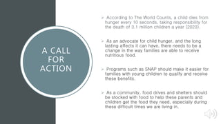 This document discusses the issue of child hunger in America. It provides statistics showing that millions of Americans struggle with hunger, including 1 in 6 children not knowing where their next meal will come from. Experiencing hunger as a child can have lasting health and developmental impacts. The document calls for reforms to programs like SNAP to make it easier for families to access food assistance, and encourages community efforts like food drives to help address the problem.