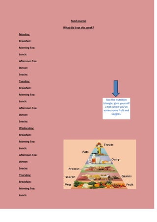 This food journal document tracks an individual's daily meals and snacks over the course of a week, including breakfast, morning tea, lunch, afternoon tea, dinner, and snacks. The journal provides a way for the individual to log what they eat each day and check if they have eaten fruits and vegetables using the nutrition triangle.