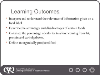 This document discusses food labels and recipe modification for healthy eating. It covers interpreting food labels and understanding nutritional information like Guideline Daily Amounts (GDAs) and traffic light labeling. It also discusses recipe modification techniques like steaming, grilling, and baking to facilitate healthy cooking. The document provides advice on reading food labels, calculating percentages of calories from fat and macronutrients, and considerations for healthy eating when dining out.