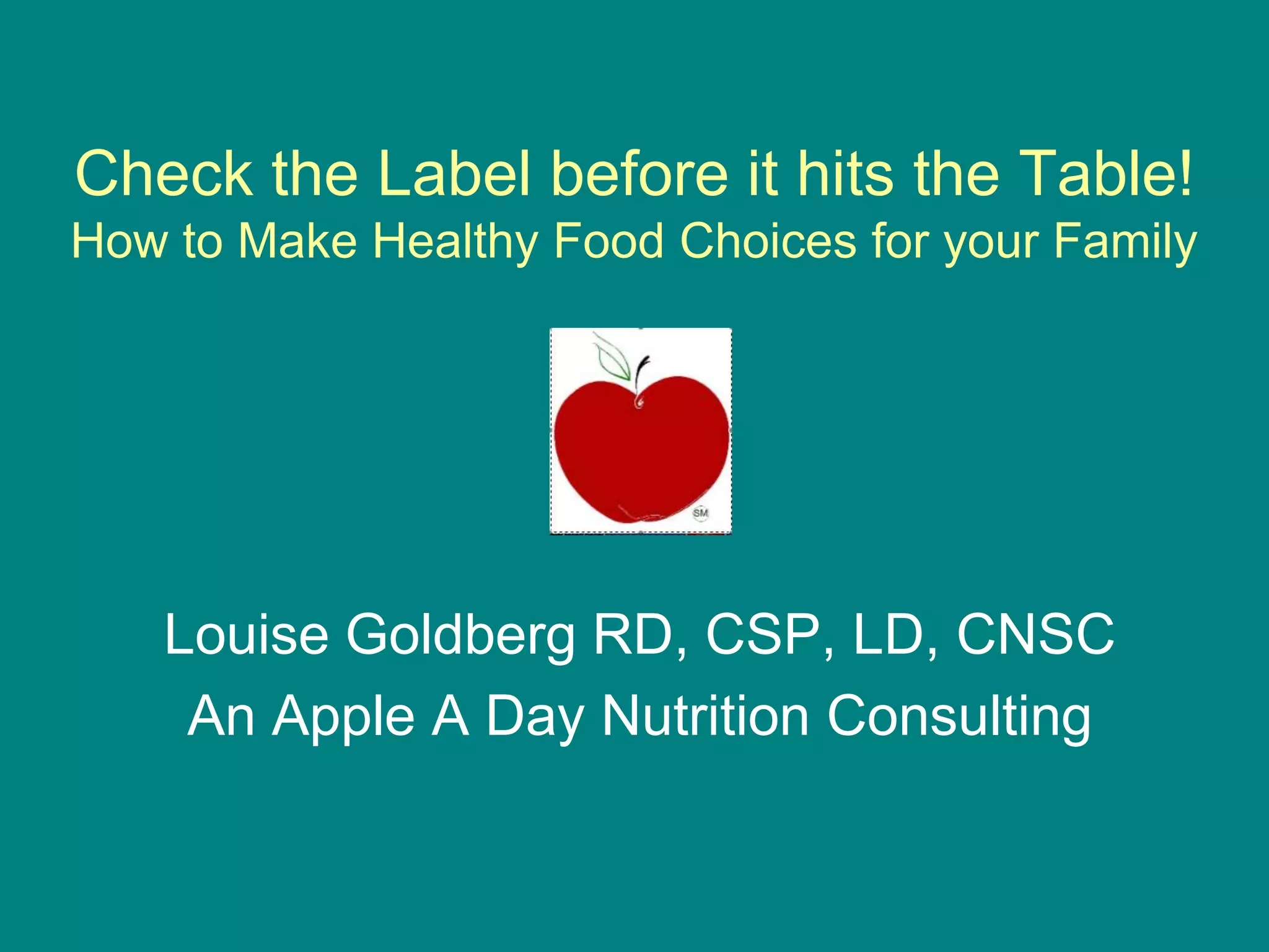 The document provides tips for making healthy food choices for families by learning to read nutrition labels and ingredients lists. It recommends paying attention to serving sizes, limiting saturated and trans fats and high fructose corn syrup, and evaluating sodium, fiber, and nutrient contents. Key words to watch out for on ingredients lists include "partially hydrogenated/hydrogenated oils" and "high fructose corn syrup," and claims like "reduced" and "whole grains" may not always mean what they imply.