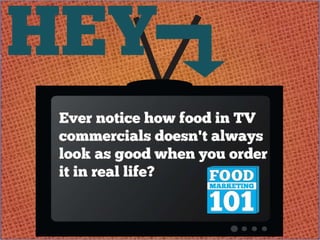 This document discusses food marketing strategies used by fast food companies and how they target different demographics. It notes that food companies spend billions of dollars on marketing each year to promote unhealthy foods to children and questions whether this type of marketing should be regulated more. The document then instructs students to get in groups and develop marketing campaigns to promote healthy food options to various audiences.