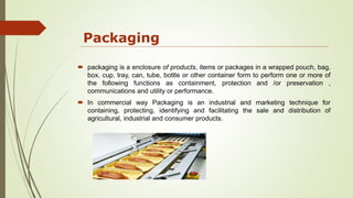 Food packaging serves several functions including containment, protection, preservation, and communication. It helps facilitate the sale and distribution of food products. Packaging materials include paper, plastic, glass, metal and combinations. There are also different types of advanced packaging like active packaging, which helps control spoilage through oxygen scavenging, and smart packaging, which provides information on food freshness. Future trends will focus on more sustainable packaging that is lighter weight, made from renewable resources and biodegradable.
