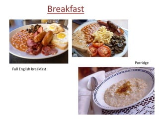A traditional English breakfast includes bacon, sausages, fried mushrooms, eggs, tomatoes, toast and baked beans. Porridge is made from oats cooked with milk. A roast dinner, often had on Sundays, features roasted meat like beef or chicken with vegetables and gravy. Fruit crumble topped with a crunchy mixture and served with custard is a popular dessert. Fish and chips can be bought wrapped in paper or on a polystyrene tray from fish and chip shops found around England.