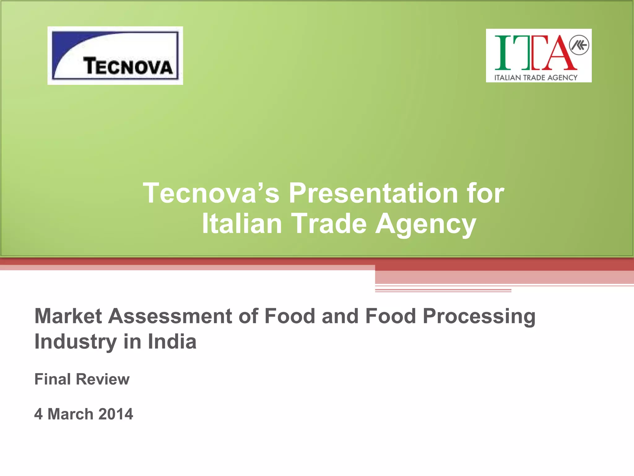 The document provides a comprehensive market assessment of the food and processing industry in India, highlighting India's macro-economic environment, food habits, and the processed food industry. It discusses demographic factors, consumer preferences, significant regional food habits, and various distribution formats while emphasizing the rising middle class's role in the industry's growth. Additionally, the document outlines competition and regulatory aspects, as well as Italy's presence in the Indian food market.
