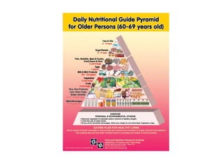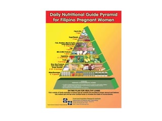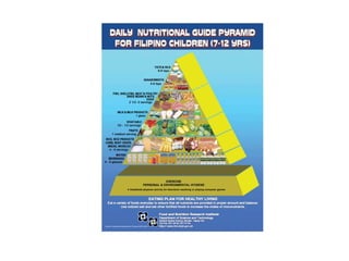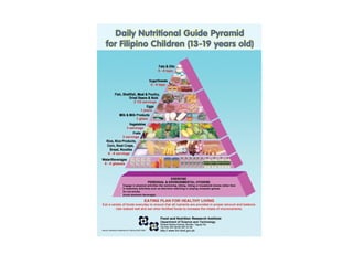 The document provides dietary guidelines for Filipinos, recommending that they eat a variety of foods every day, including fish, lean meats, poultry, beans, fruits, vegetables, roots crops, and foods prepared with edible oils. It also recommends consuming milk, milk products, and other calcium-rich foods like small fish and dark green leafy vegetables every day, as well as using iodized salt in moderation. Regular exercise and avoiding smoking and excessive alcohol are also advised.