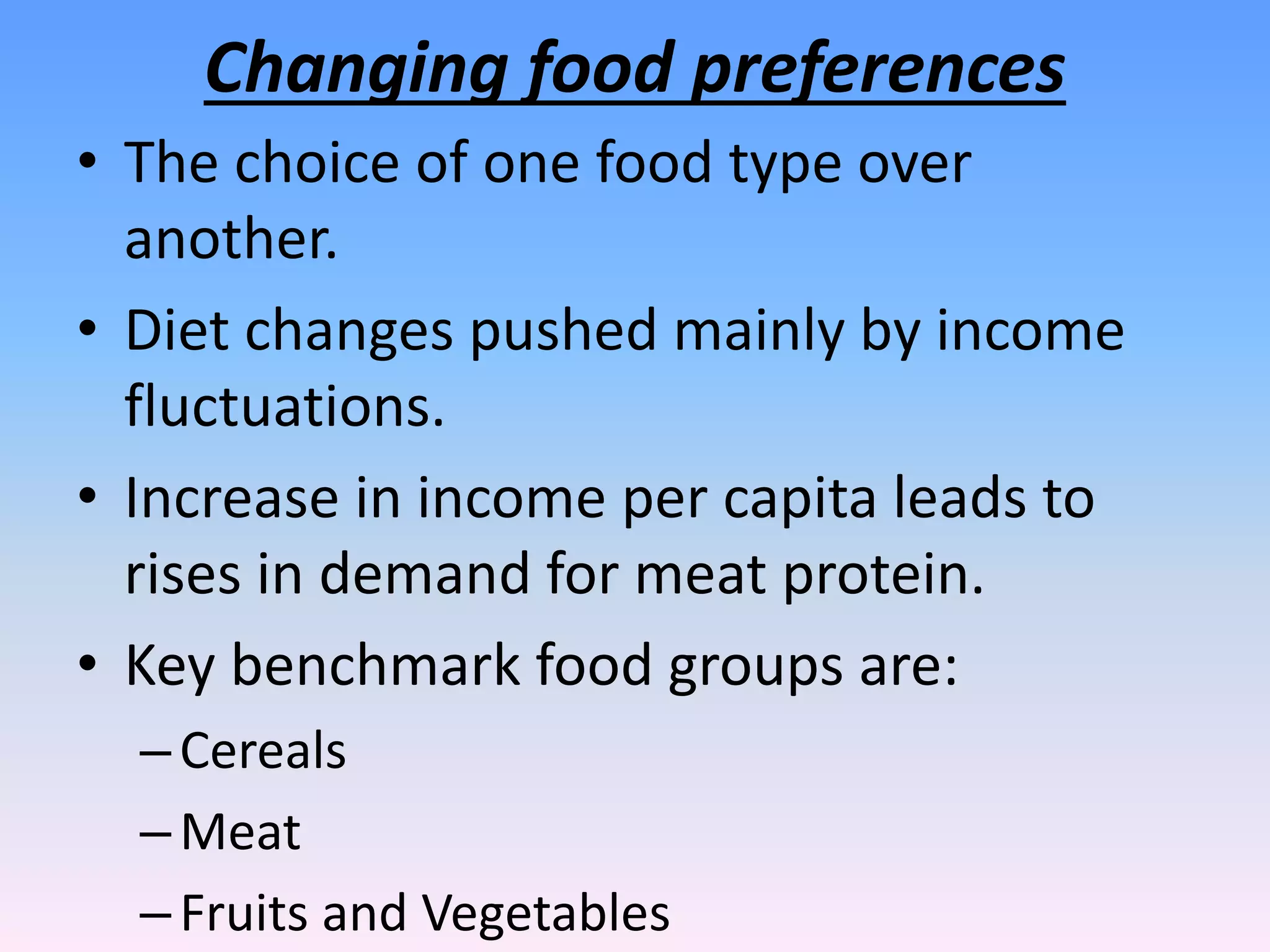 This document discusses changing food preferences and consumption patterns between developed and developing countries. As income rises in developing countries, diets shift away from staple cereals towards more meat and dairy. Developed countries see a decline in red meat consumption and rise in fruits and vegetables due to health concerns. Food choices are influenced by economic, sociocultural and political factors like income, prices, traditions, migration and government policies around food supply stability and safety.