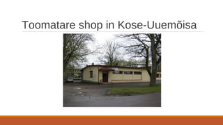 Students from different years conducted a survey at a local shop to research the availability of foods from different countries. Year 1 looked at Italian foods and found many pasta, fruit, and drink options. Year 2 struggled to find foods from Romania, Greece or Cyprus. Year 3 identified a variety of Polish foods like apples, cheese and meat. Year 4 cataloged the large selection of local Estonian dairy products, breads, meats, canned goods and juices available. The survey showed a good selection of Italian and Polish foods but few from southeastern Europe, and emphasized the prominence of Estonian agricultural products in the store.