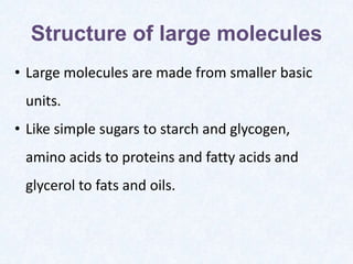 Large molecules are composed of smaller units that combine. Carbohydrates include sugars, starches, and cellulose, and are made from monosaccharides. Proteins are made from amino acids linked by peptide bonds. Fats are triglycerides composed of fatty acids and glycerol. Food tests can identify these macromolecules using Benedict's solution for sugars, Biuret reagent for proteins, iodine for starches, and ethanol for fats. The document provides details on procedures and results for each of these common food tests.