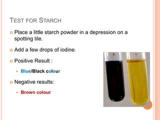 The document describes procedures for testing foods for the presence of starch, glucose, proteins, and oils/fats. For each test, it provides the steps to perform the test along with the expected color change results for a positive or negative indication of the substance being tested. The tests involve adding reagents like iodine, Benedict's solution, Biuret reagent, or water and observing any color changes that confirm or rule out the presence of starch, glucose, proteins, or oils/fats.