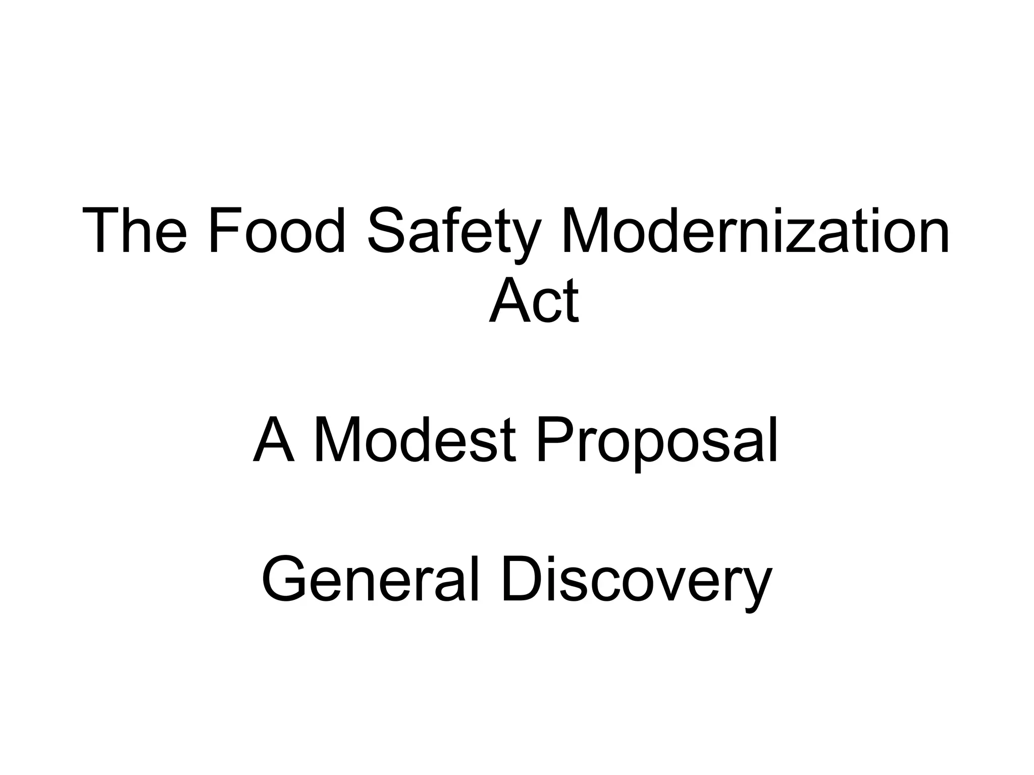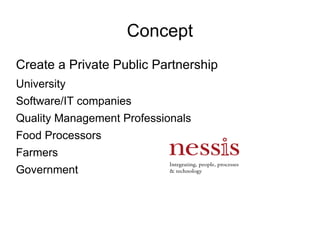 The document discusses the Food Safety Modernization Act in the US and its potential impacts on Ontario's agriculture and food processing industries. It proposes creating a private-public partnership to implement a new approach and disruptive technology using RFID, barcodes, and other real-time tracking methods. This would allow ingredients to be traced one step up and down the supply chain to contain any potential issues, as required by the US law. The partnership would develop and pilot a software program to test the new tracking system and evaluate its effectiveness.