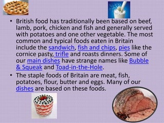 - Typical British foods are Yorkshire pudding, fish and chips, roast meats, cottage pie, full English breakfast, and various puddings and cakes associated with holidays and festivals throughout the year.