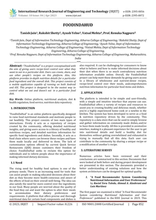 This document describes a proposed online platform called FoodInDaHud that aims to promote healthy eating habits. It consists of a mobile app that allows users to browse recipes, view detailed nutrition information, and customize recipes based on their dietary preferences. The app also enables users to order customized meals locally and have them delivered. The platform utilizes a recipe browser, nutrition profiler, nutrition query engine, and order/delivery system. It seeks to provide users with recipe-level control over their meals and educate them about making informed dietary choices. The platform could be expanded further with additional features like personalized meal plans, special diet options, and voice recipe creation.