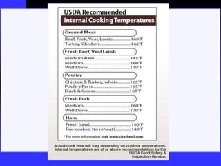 This document discusses food safety and foodborne illnesses. It covers topics such as pathogens that cause foodborne illness, high-risk populations, food safety principles like keeping food at proper temperatures, and prevention methods. It also discusses food safety regulations and standards as well as challenges and future implications in ensuring food safety. Hazard Analysis Critical Control Points (HACCP) is introduced as a food safety management system.