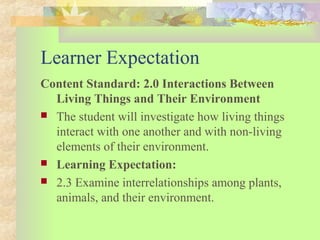 This document provides instructions for an activity to examine interrelationships among plants, animals, and their environment through investigating food webs. The activity will have students find that ecosystems contain multiple overlapping food chains that form food webs, discover that organisms can be both predators and prey, and write a paragraph describing how a food web works by explaining that some animals serve as both predators and prey.