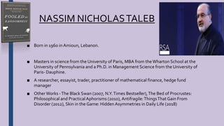The document provides an overview of Nassim Nicholas Taleb's life, education, and work, emphasizing key themes from his books on randomness and success. It discusses concepts such as survivorship bias, the significance of magnitude over frequency in outcomes, and the role of luck in performance assessments. The document also highlights how human behavior is affected by randomness and the emotional biases that can distort rational decision-making.