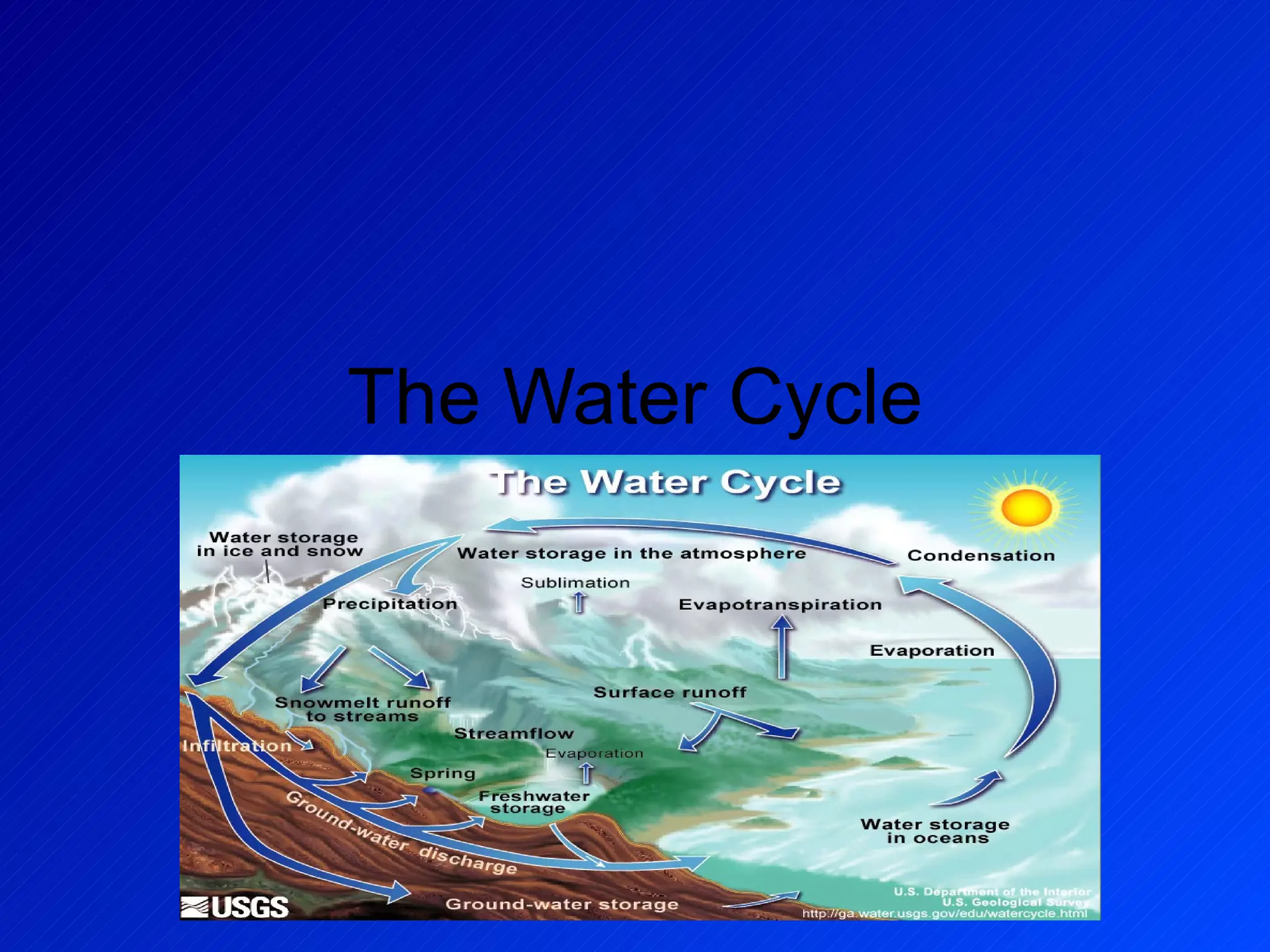 The water cycle describes the continuous movement of water on, above, and below the surface of the Earth. It includes processes such as evaporation where water is changed to a gas, condensation where it returns to a liquid form in clouds, and precipitation where it falls back to Earth as rain, snow, hail or sleet. The water is then absorbed by plants through transpiration or runs across the land as surface runoff before the cycle repeats.