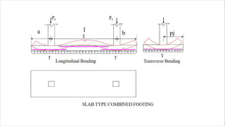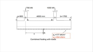 - The document discusses the design of a combined footing to support two columns carrying loads of 700 kN and 1000 kN respectively.