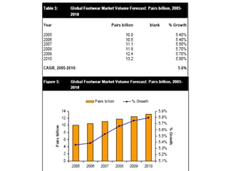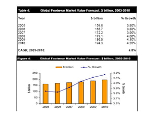 The document discusses the global and Indian footwear markets. The global footwear market grew 3.8% in 2005 to $159.6 billion and is forecast to reach $194.3 billion by 2010. In India, liberalization increased purchasing power and the footwear market grew 8% in 2004 to 1.8 billion pairs worth $2.4 billion. Major Indian brands include Bata, Liberty, Woodland, and Reebok. The market is shifting towards branded, casual styles and growth in sportswear, women's/kids segments.