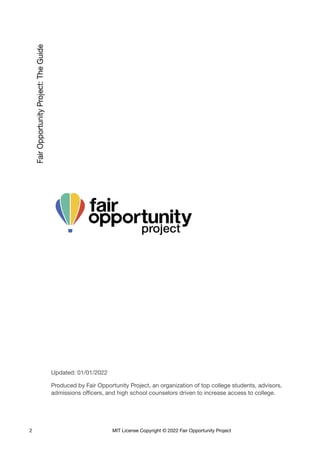 This document is a college admissions and financial aid guide produced by Fair Opportunity Project. It aims to increase access to college for all students by providing free resources and information. The guide covers the entire college application process, from sophomore year of high school through applying to scholarships as a senior. It includes timelines, checklists, chapters on standardized tests, essays, interviews and more. The organization also offers additional free services like mentoring, virtual office hours and essay reviews to help students succeed.