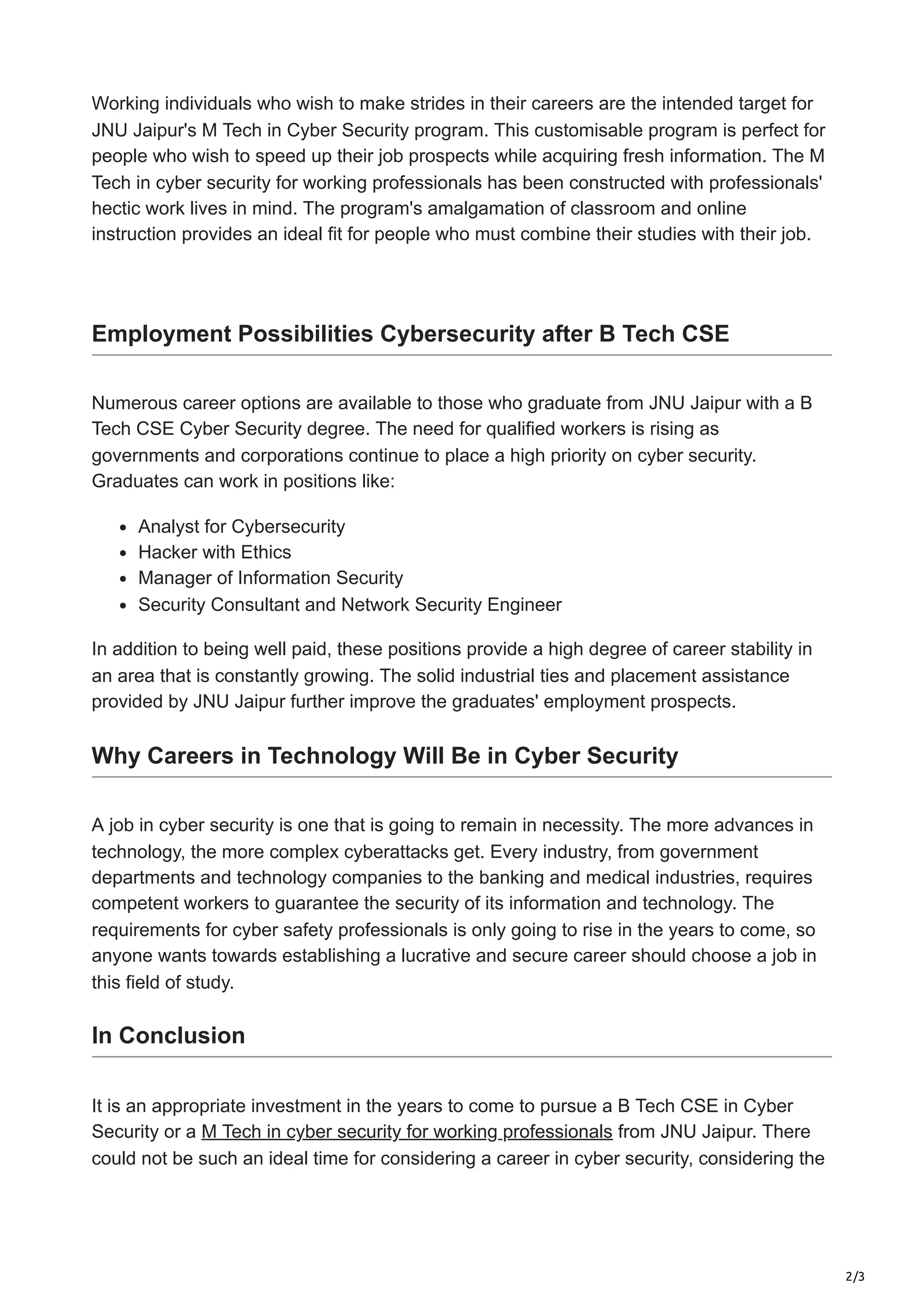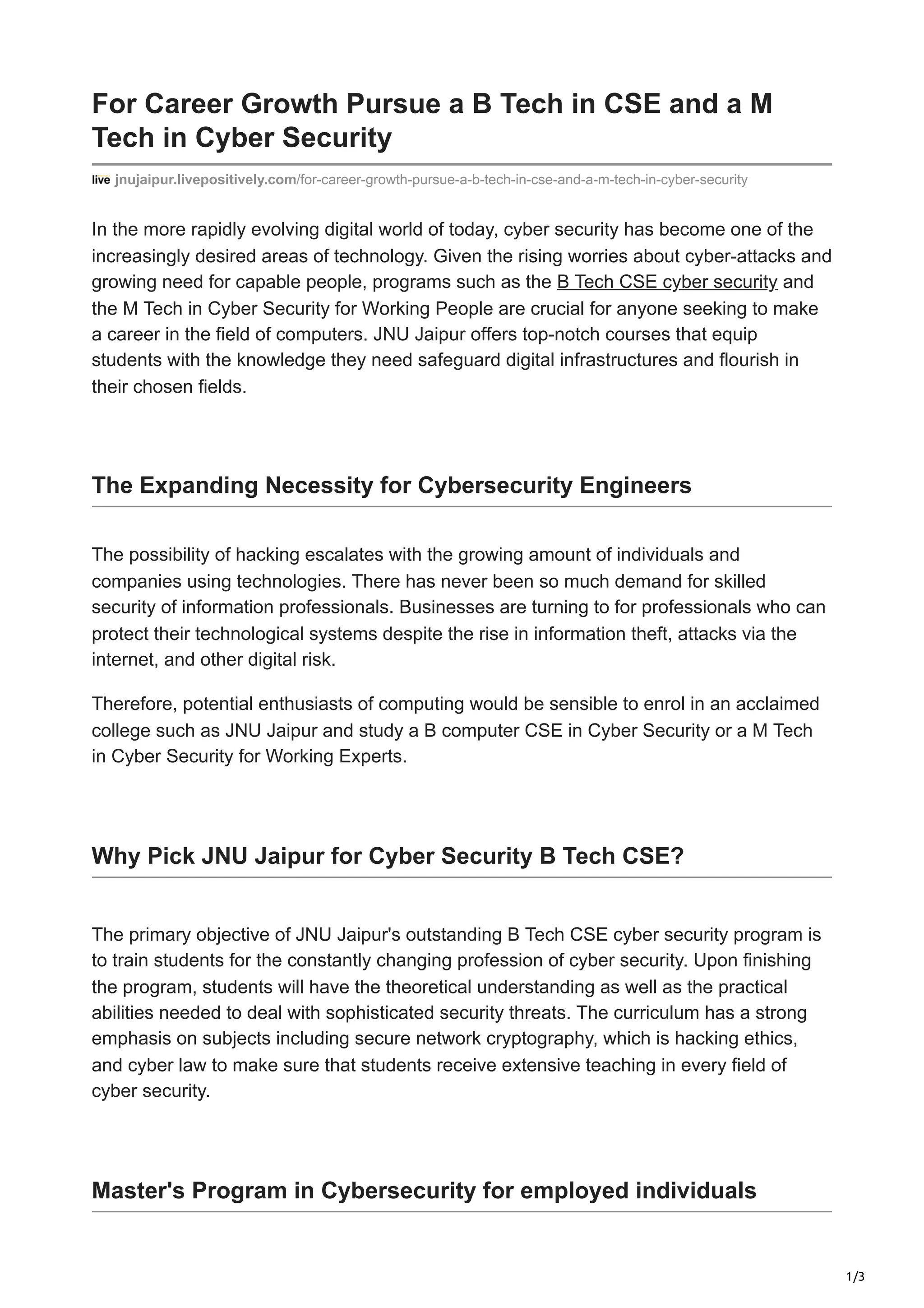In the more rapidly evolving digital world of today, cyber security has become one of the increasingly desired areas of technology. Given the rising worries about cyber-attacks and growing need for capable people, programs such as the B Tech CSE cyber security and the M Tech in Cyber Security for Working People are crucial for anyone seeking to make a career in the field of computers.