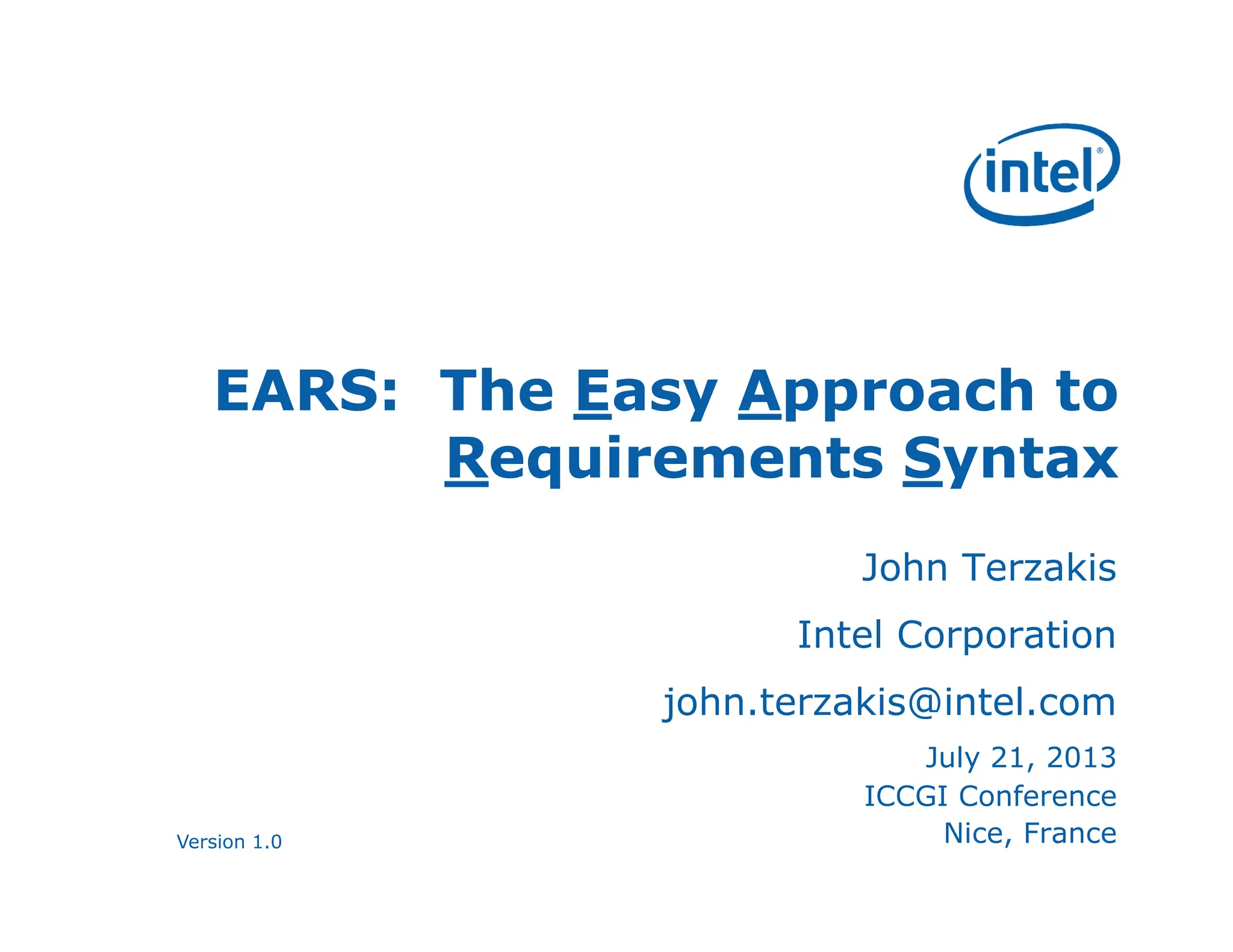 (Easy Approach to Requirements Syntax), Alistair Mavin et al, 17th IEEE International Requirements Engineering Conference (RE 09) Big EARS: The Return of Easy Approach to Requirements Syntax, Alistair Mavin et al, 18th IEEE International Copyright © 2013 Intel Corporation. All Rights Reserved. No part of this presentation may be copied without the written permission of Intel Corporation. 55 Syntax, Alistair Mavin et al, 18th IEEE International Requirements Engineering Conference (RE 10)