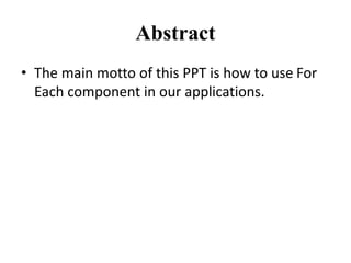The document discusses using the ForEach component in Mule applications. It iterates over elements in a collection and processes them individually through embedded processors. The example shows querying a database table, storing the results in a payload, and then using ForEach to log each record. ForEach splits the payload collection and allows processing each element one by one through nested processors like Logger.