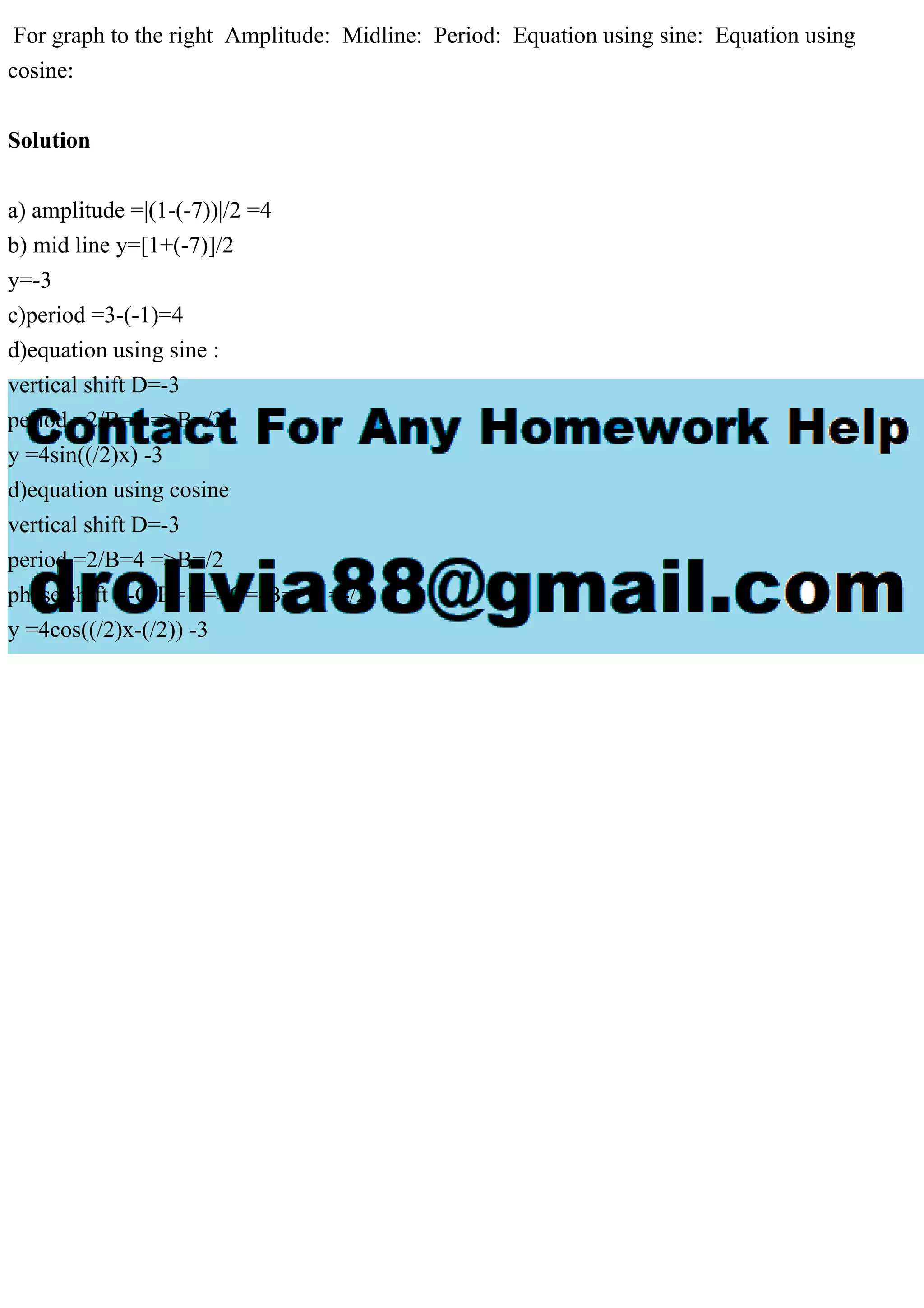 ![For graph to the right Amplitude: Midline: Period: Equation using sine: Equation using