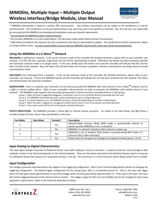 The MIMOlite module is a wireless interface/bridge module that provides one analog or digital input and one relay output. It can be controlled via Z-Wave and includes status lights to indicate inclusion in a network. The module converts an input signal to a digital value and allows the input trigger levels and relay operation to be configured for flexibility. It has been certified for use in the US, EU, and other regions.