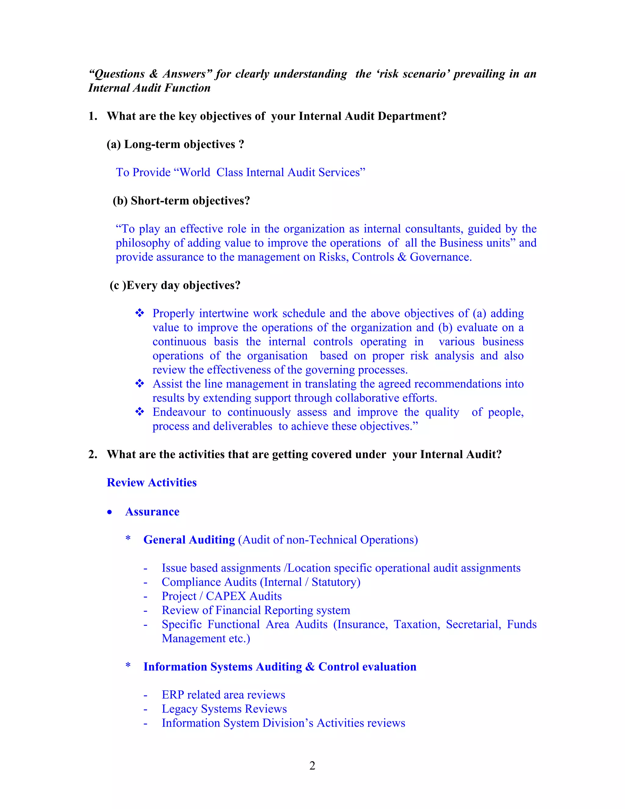 The document discusses conducting risk assessment for an internal audit department. It begins by outlining the key objectives and activities of the internal audit function. It then provides a list of 27 questions and answers to map out the internal audit processes, inherent risks, and key controls. The questions cover topics like audit planning, coordination with other departments, reporting structure, budgeting, performance metrics, theoretical risks, and controls. The overall purpose is to establish a proper risk management process for the internal audit department.